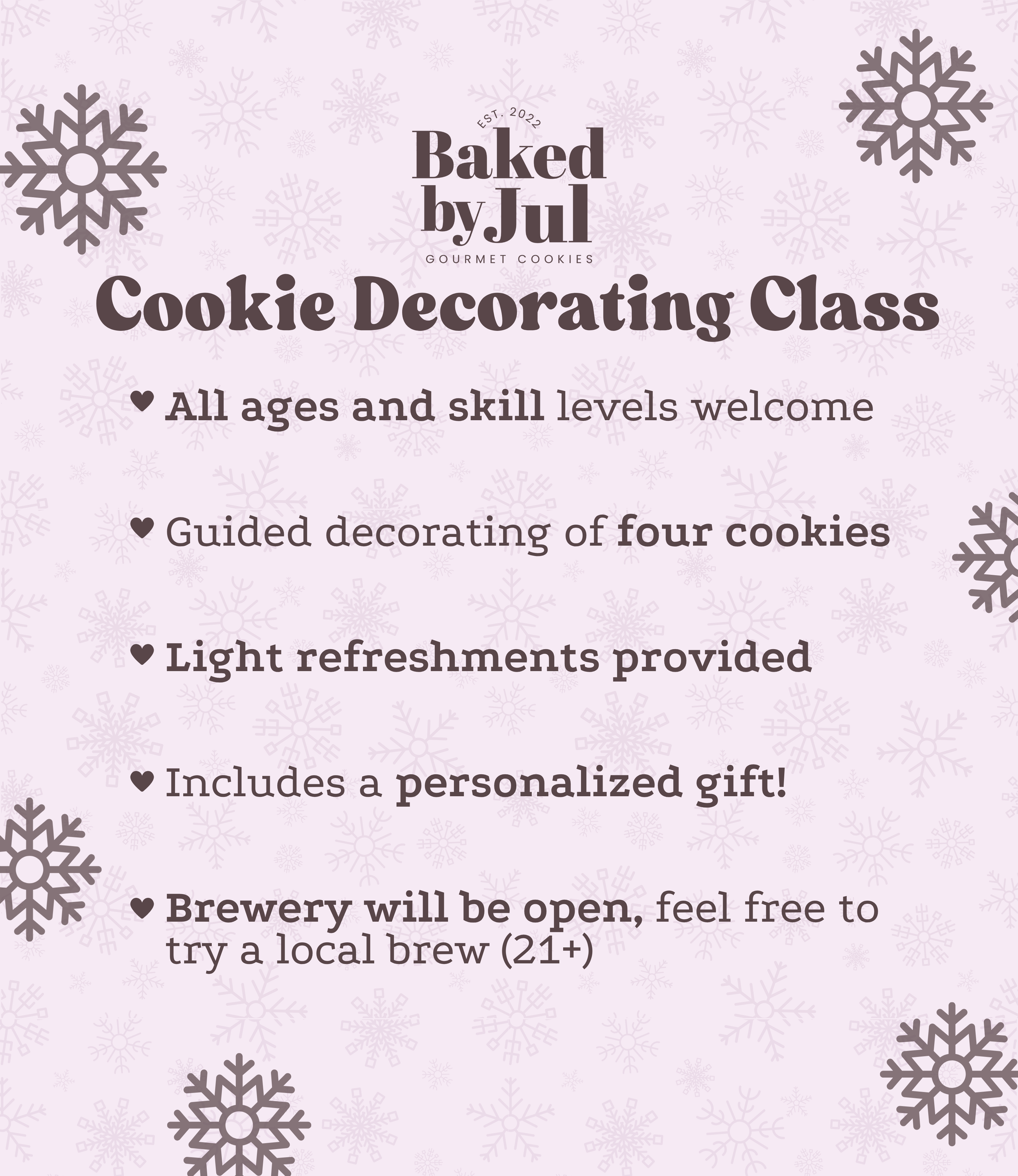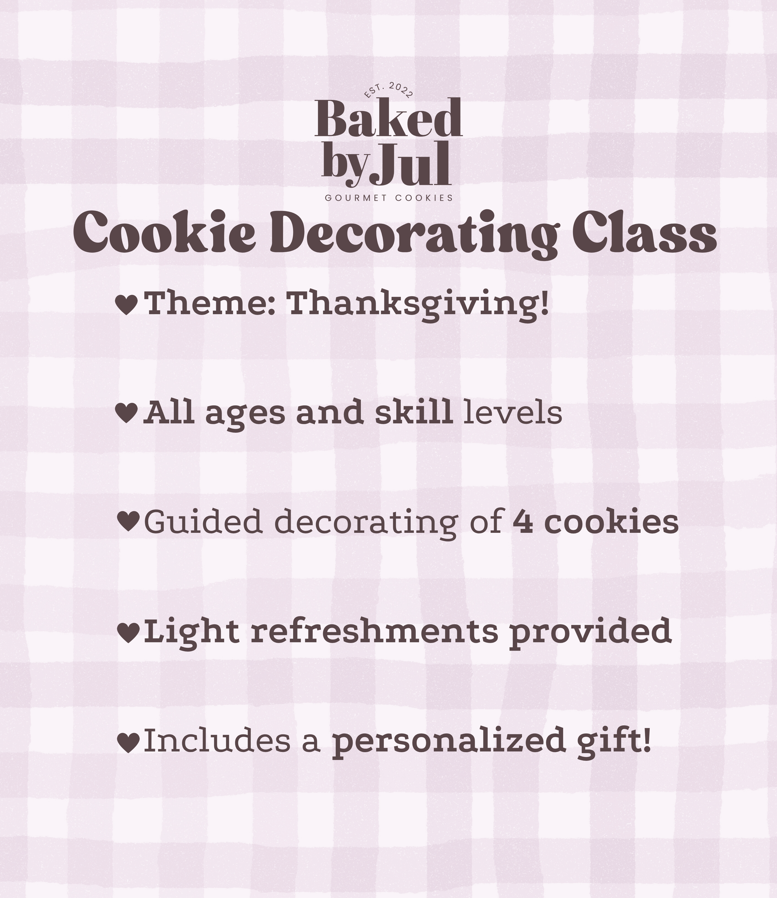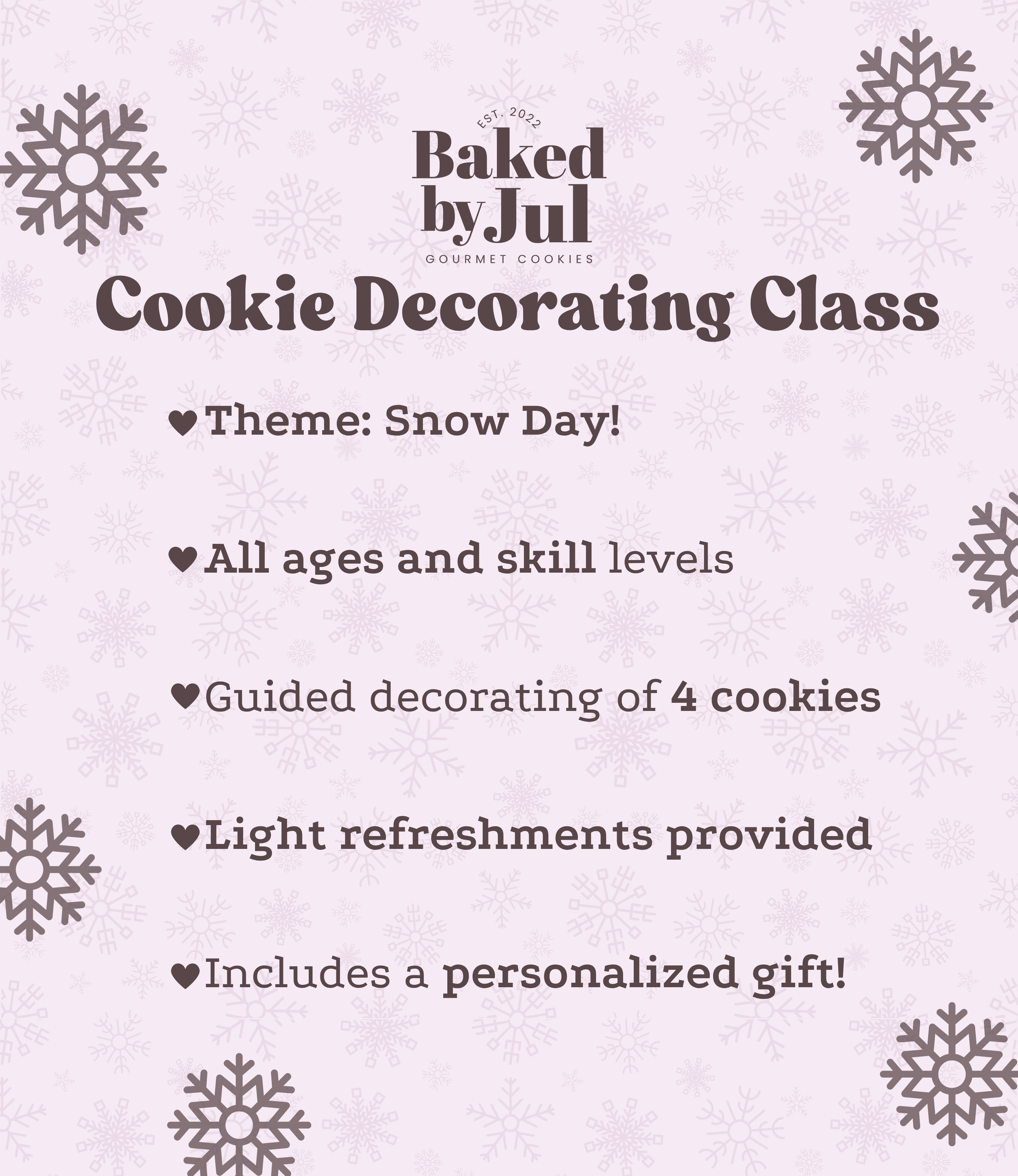 Cookie Decorating Classes Classes Halloween Cookie Class $45.00 Only 7 available Add to Cart Added! Thanksgiving Cookie Class $45.00 Add to Cart Added! Thanksgiving Cookie Class $45.00 Add to Cart Added! Snow Day Cookie Class $45.00 Add to Cart Added! Snow Day Cookie Class $45.00 Add to Cart Added! Holiday Baking Cookie Class $55.00 Only 7 available Add to Cart Added! Private class / cookie decorating kit inquiry: Name * First Name Last Name Email * Which would you like more information about? * Hosting a Private Class Purchasing Cookie Decorating Kits Thank you for submitting a response! Baked by Jul will contact you in 1-2 business days.